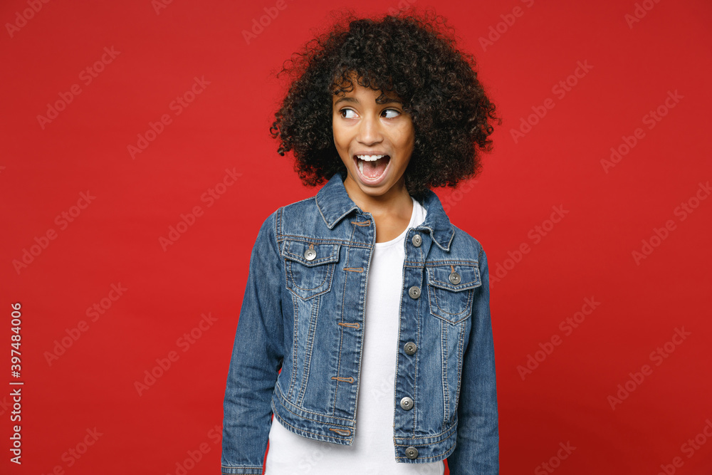 Excited amazed little african american kid girl 12 13 years old wearing casual denim jacket looking aside isolated on bright red color background children studio portrait. Childhood lifestyle concept.... Very well made.