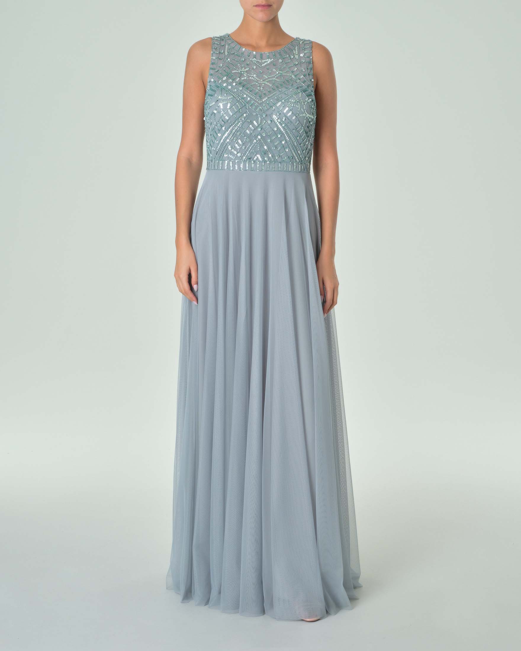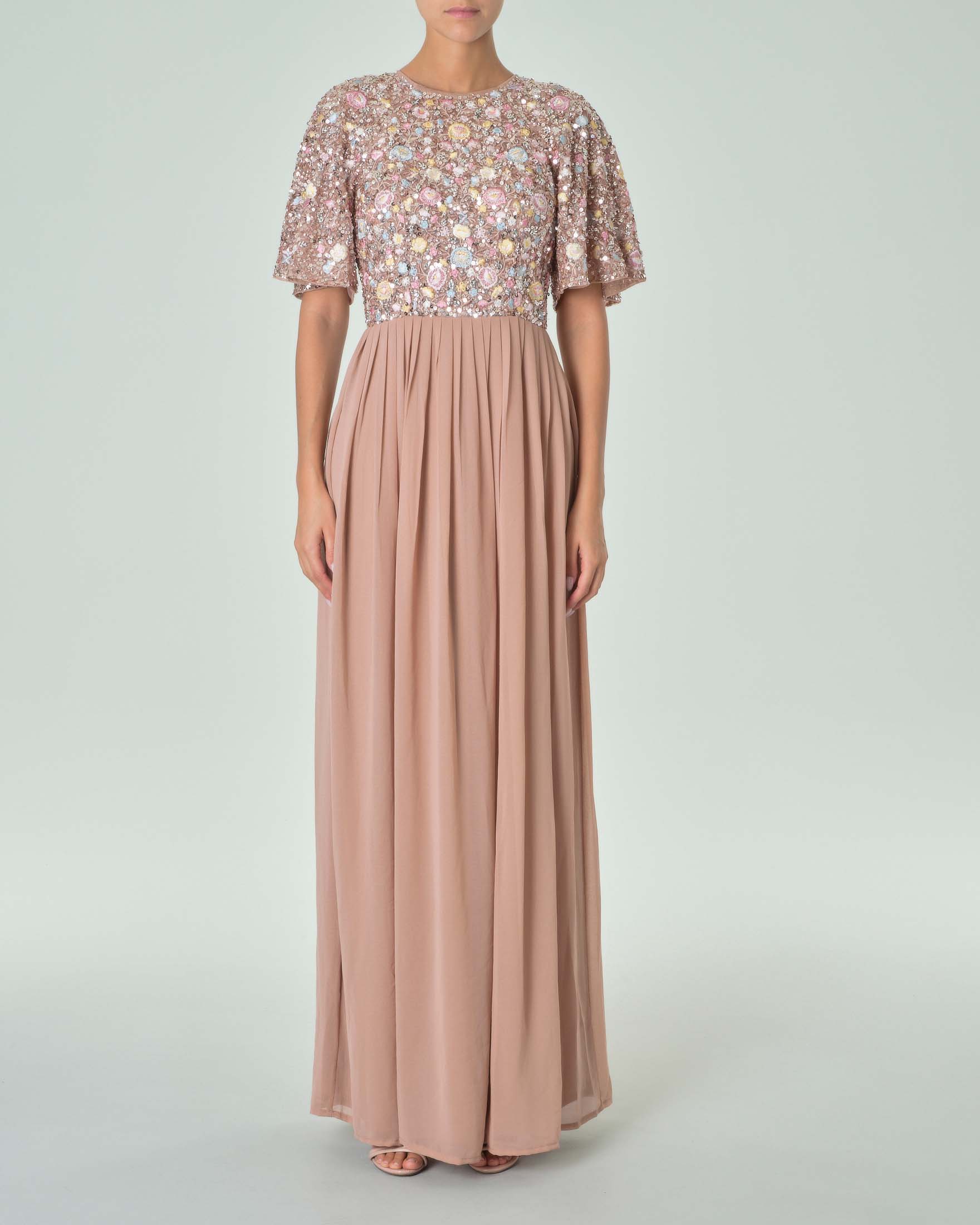Abito lungo color taupe con gonna in georgette e corpetto a maniche corte in paillettes Very well made.